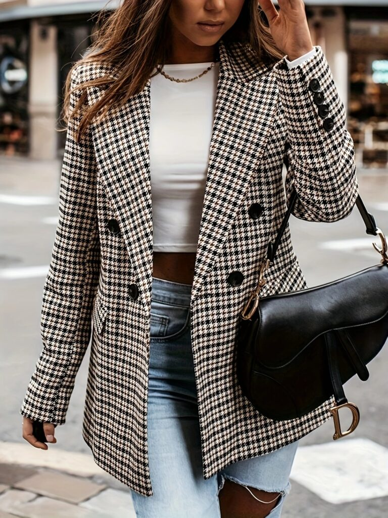 Redefine office chic with this statement houndstooth blazer, blending boardroom polish with contemporary comfort.